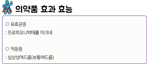 이 의약품은 '항균작용을 나타냄으로써 세균감염에 의한 여드름을 치료하는 약'이니 참고하시길 바랍니다.
