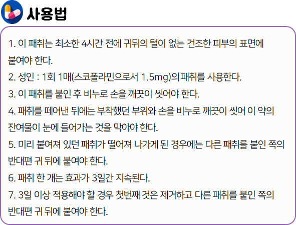: 항구토 및 항현훈 작용을 나타내어 멀미로 인한 구역, 구토 및 어지러움증을 예방하는 약