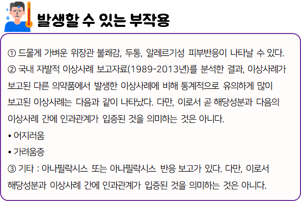 몸에 맞지 않는 의약품의 경우 크고 작은 이상 반응을 불러일으킬 수 있으므로 드시기 전에 반드시 부작용이나 주의사항 등을 미리 확인하시길 바랍니다.