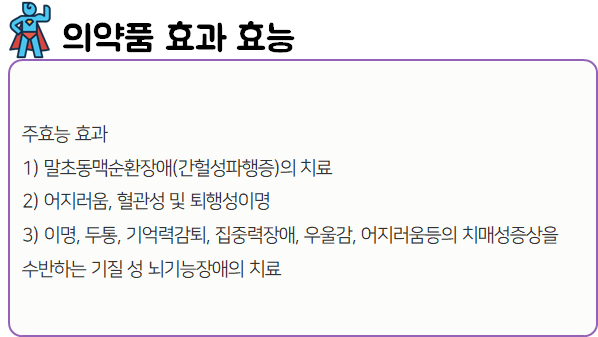 이 의약품은 '혈관보호 및 혈관확장 작용을 통해 혈액순환을 촉진하고, 뇌기능을 개선시켜주는 약'이니 참고하시길 바랍니다.