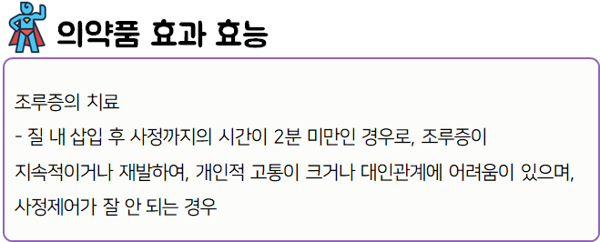 이 의약품은 질내 삽입후 사정까지의 시간이 2분 미만인 조루증의 치료 및 재발 방지를 위해 사용하는 약이니 참고하시길 바랍니다.