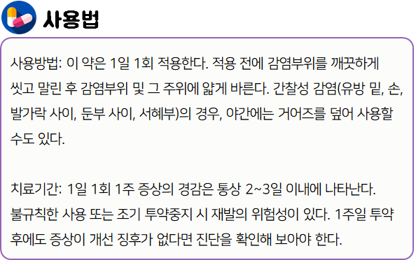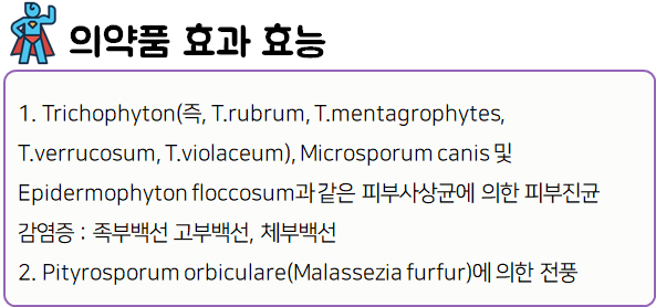 이 의약품은 ' 항진균 작용을 나타냄으로써 곰팡이균(진균)에 의한 피부 감염증을 치료하는 약'이니 참고하시길 바랍니다.