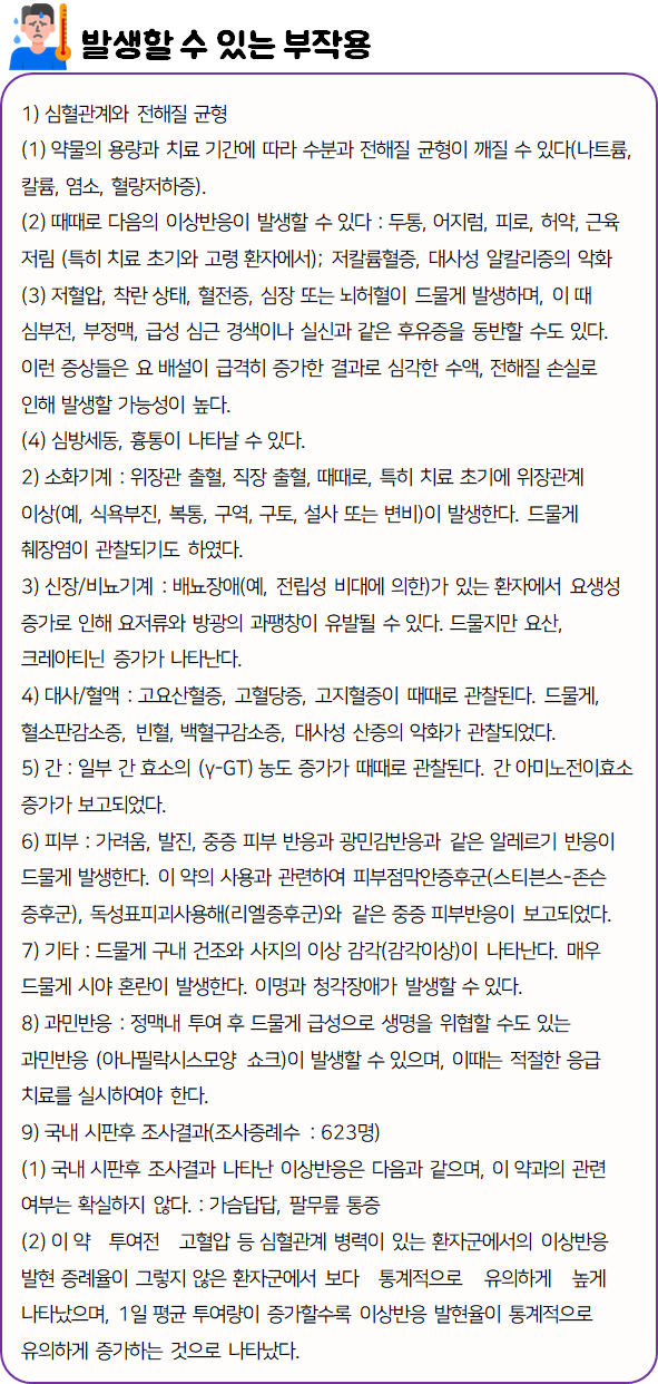 이 의약품은 신장에서 나트륨 및 수분의 재흡수를 억제하여 혈압을 감소시키고 부종을 치료하는 약이니 참고하시길 바랍니다.