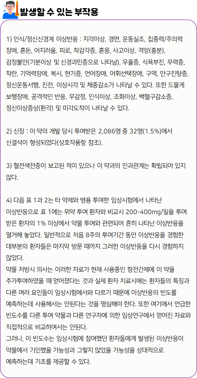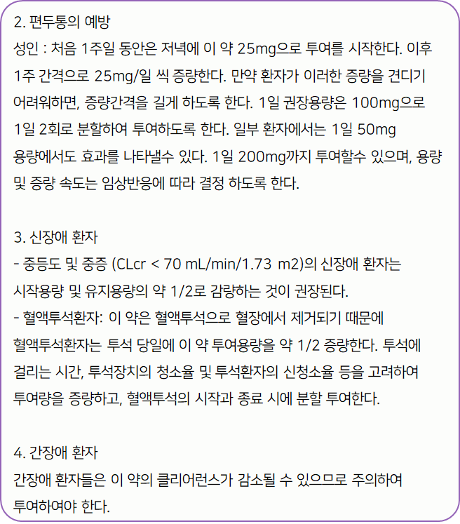 이 의약품은 과도하게 흥분한 신경막을 안정시킴으로써 경련의 빈도를 감소시키고, 편두통을 예방하는 약이니 참고하시길 바랍니다.
