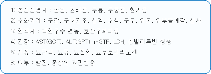 - A를 복용할 시 다음과 같은 부작용이 발생할 수 있으니 주의하시길 바랍니다.