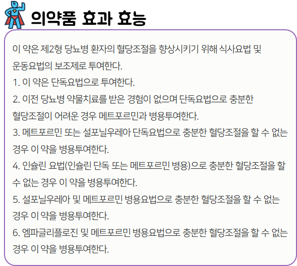 이 의약품은 '인슐린 방출 자극 물질의 분해를 억제하여 인슐린 분비를 촉진함으로써 혈당을 감소시키는 약'이니 참고하시길 바랍니다.