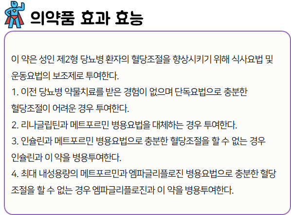이 의약품은 인슐린 분비를 촉진하고, 당 생성을 억제하며 당의 사용을 증가시켜 혈당을 감소시키는 약이니 참고하시길 바랍니다.