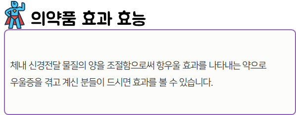 이 의약품은 체내 신경전달 물질의 양을 조절함으로써 항우울 효과를 나타내는 약이니 참고하시길 바랍니다.