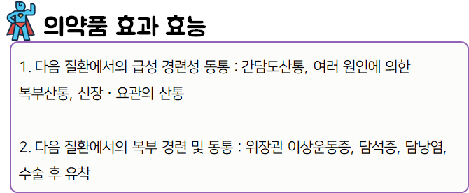 이 의약품은 평활근 경축을 완화시킴으로써 항경련 및 진통 효과를 나타내는 약이니 참고하시기 바랍니다.