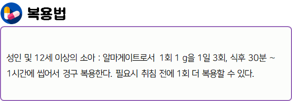 이 의약품은 위산을 중화하고, 펩신(단백분해효소)의 작용을 감소시킴으로써 위내 통증 및 궤양형성을 방지하는 약이니 참고하시길 바랍니다.
