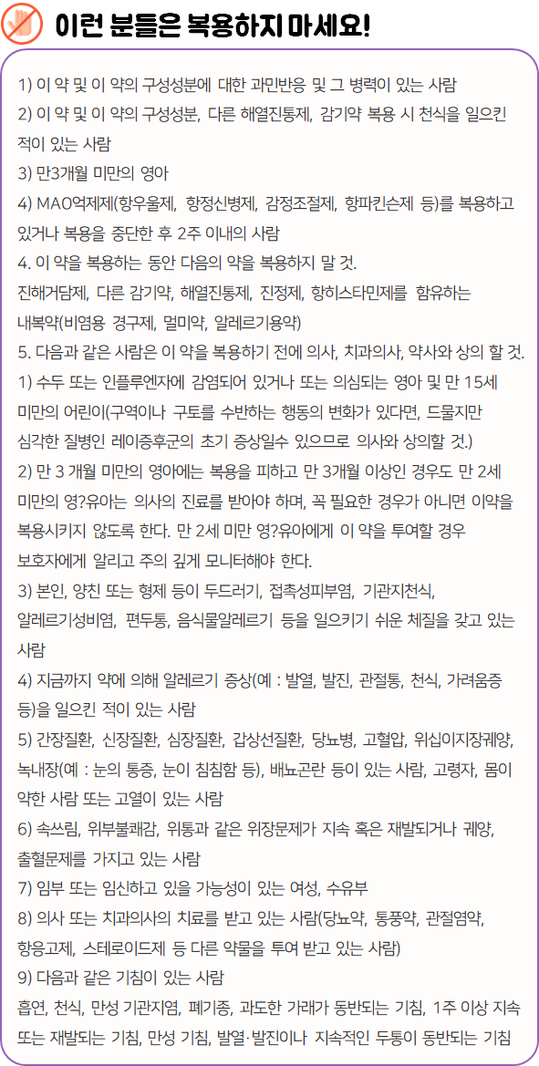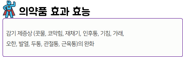 이 의약품은 오한, 발열, 콧물, 코막힘 등의 감기 증상을 개선하는 안전상비의약품이니 참고하시길 바랍니다.