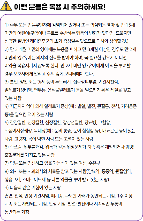 - 다음 환자는 복용 전 전문가 or 의사와 상담 후 복용하시길 바랍니다.