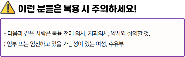 - 다음 환자는 복용 전 전문가 or 의사와 상담 후 복용하시길 바랍니다.