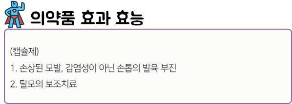 이 의약품은 미노산,단백질,비타민B 등 각종 영양분을 공급하여 건강한 모발성장 촉진 및 손발톱 발육부진을 개선해주는 약이니 참고하시길 바랍니다.
