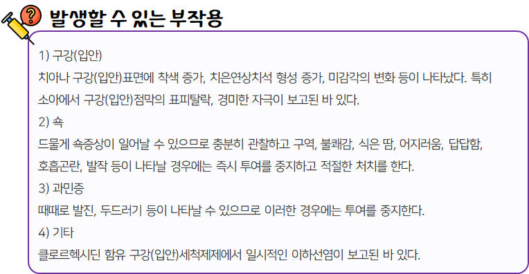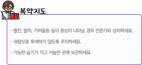 또한 사용 중에 부작용 등의 이상반응이 나타날 시 즉시 복용을 멈추고, 전문가 or 의사와 상담하신 후 사용량을 줄이거나 사용을 멈추시는 것이 좋습니다.