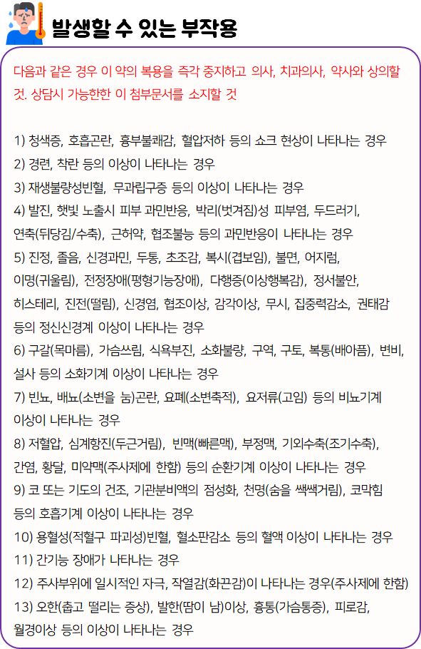 의약품은 반드시 복용 전에 복용 시 발생할 수 있는 부작용이나 주의사항 등을 미리 확인하신 후 드셔야 안전하게 먹을 수 있습니다.