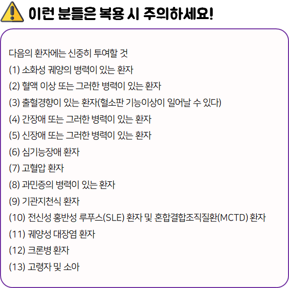 - 다음 환자는 복용 전 전문가 or 의사와 상담 후 복용하시길 바랍니다.
