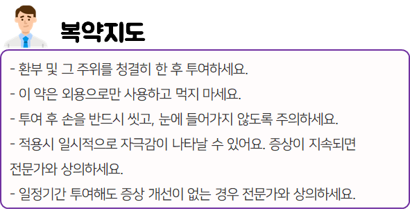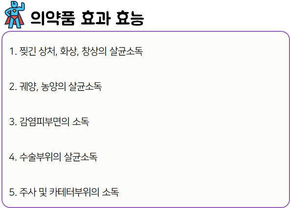 이 의약품은 '상처, 화상, 감염피부 및 의료기구의 살균소독을 위해 사용하는 제제'이니 참고하시길 바랍니다.