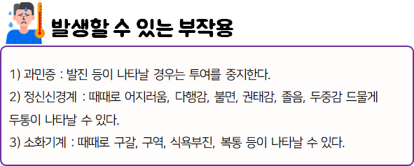 또한 복용 중 이상 반응이 나타나면 즉시 복용을 멈추고, 전문가나 의사와 상담하셔서 복용량을 줄이거나 복용을 멈추시는 것이 좋습니다.