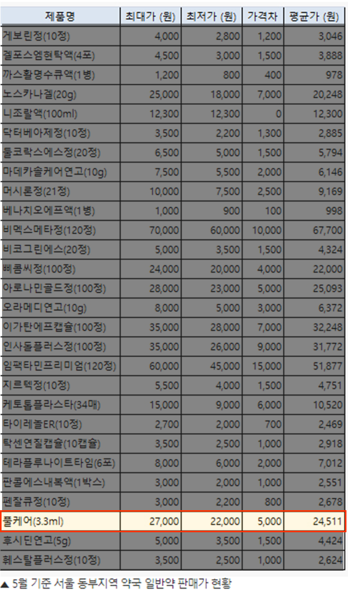 풀케어 플러스크림은 전국 약국에서 구매가 가능한데, 2020년 5월 기준 최대가 27,000원 최저가 22,000원으로 지역마다 5,000원 정도의 차이를 보였습니다.