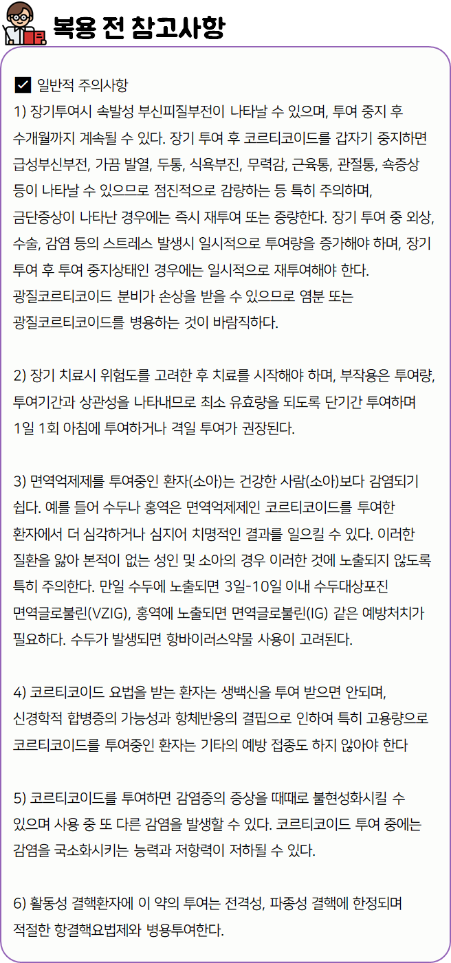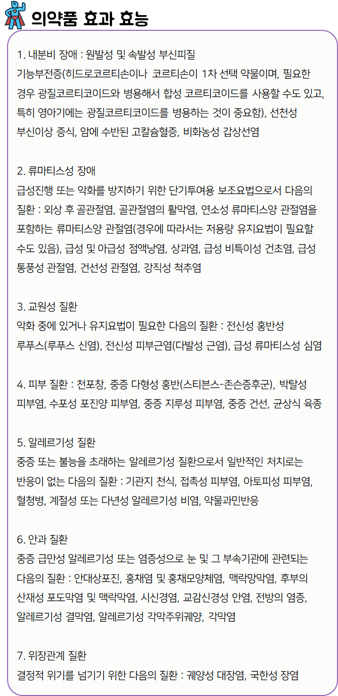 이 의약품은 면역억제 및 항염작용을 나타내는 호르몬제로 내분비장애 또는 각종 염증질환에 사용하는 약이니 참고하시기 바랍니다.