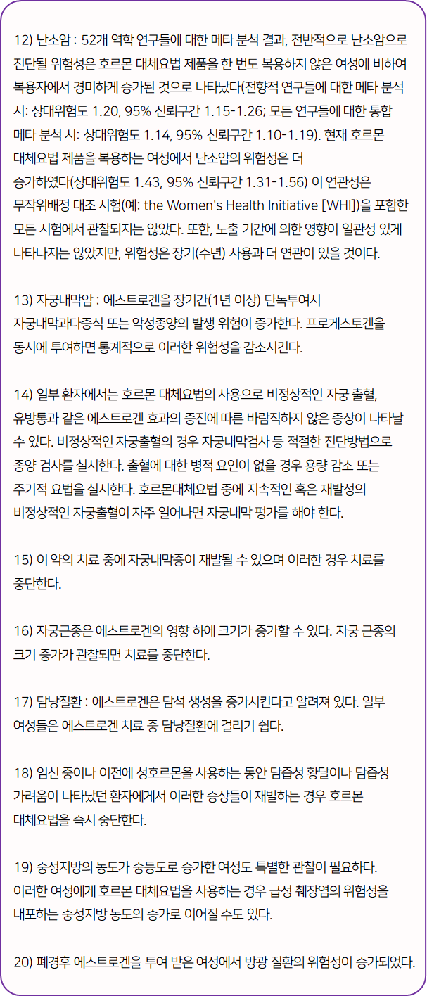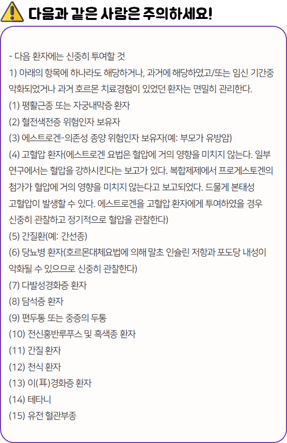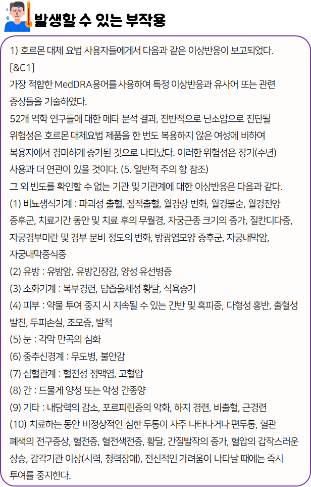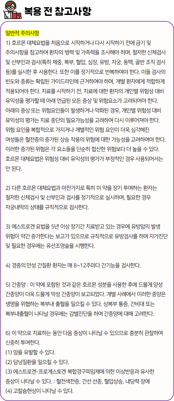 이 의약품은 '에스트로겐 제제로서 각종 에스트로겐 결핍증상(갱년기 장애 등)을 치료하는 약'이니 참고하시길 바랍니다.