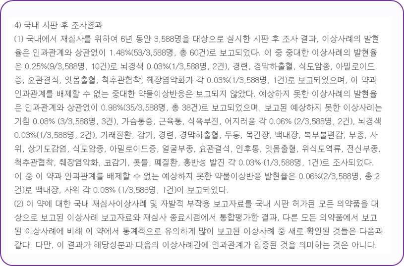 또한 복용 중 부작용 등의 이상반응이 나타날 시 즉시 복용을 멈추고, 전문가 or 의사와 상담하신 후 복용량을 줄이거나 복용을 멈추시는 것이 좋습니다.