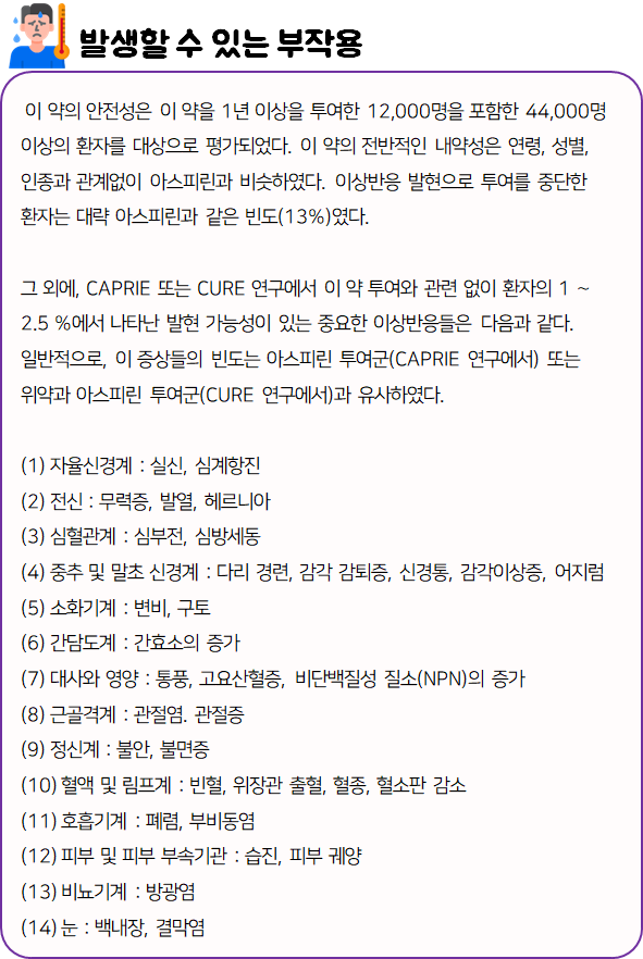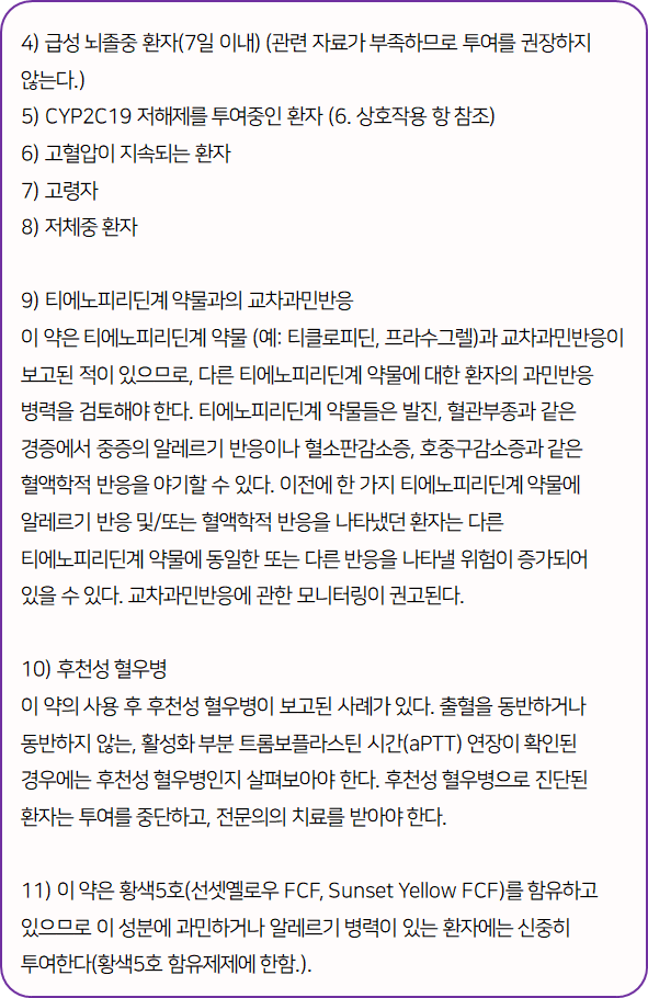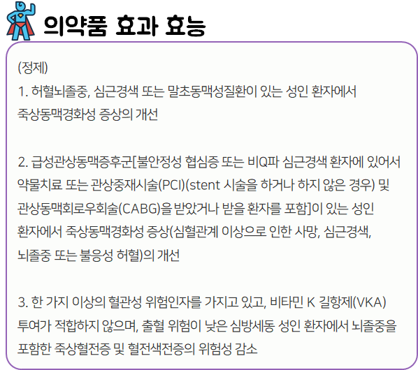 이 의약품은 혈소판 응집을 억제하여 혈전 생성을 방지하는 약이니 참고하시길 바랍니다.