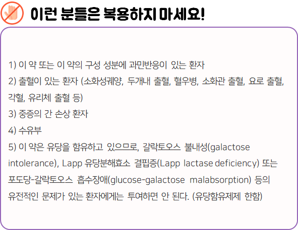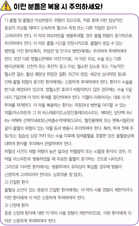 이 의약품은 혈소판 응집을 억제하여 혈전 생성을 방지하는 약이니 참고하시길 바랍니다.