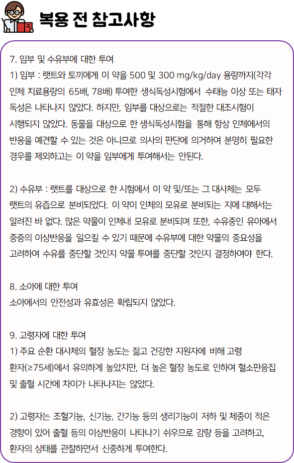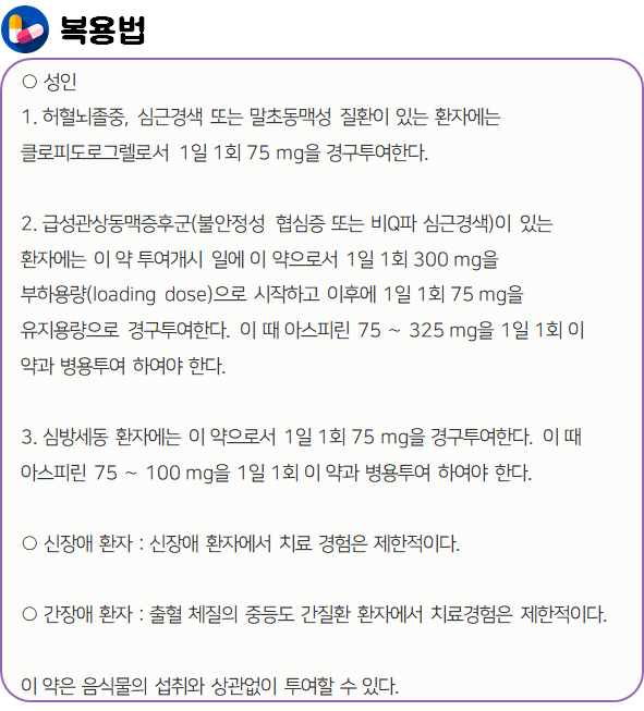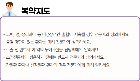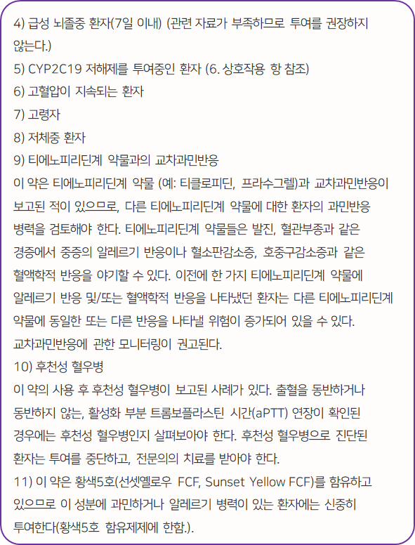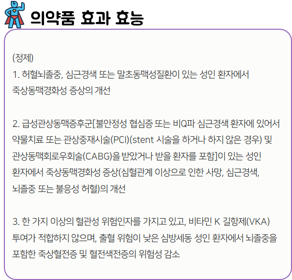 이 의약품은 혈소판 응집을 억제하여 혈전 생성을 방지하는 약이니 참고하시길 바랍니다.