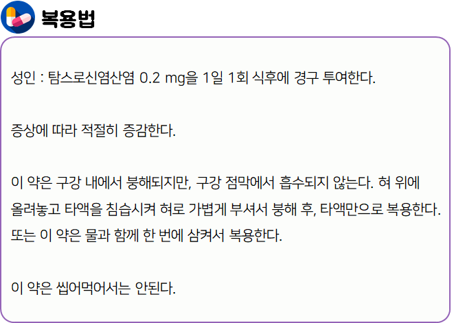이 의약품은 전립선 평활근을 이완시켜 요도 압력을 낮춤으로써 전립선비대로 인한 증상을 개선시키는 약이니 참고하시길 바랍니다.