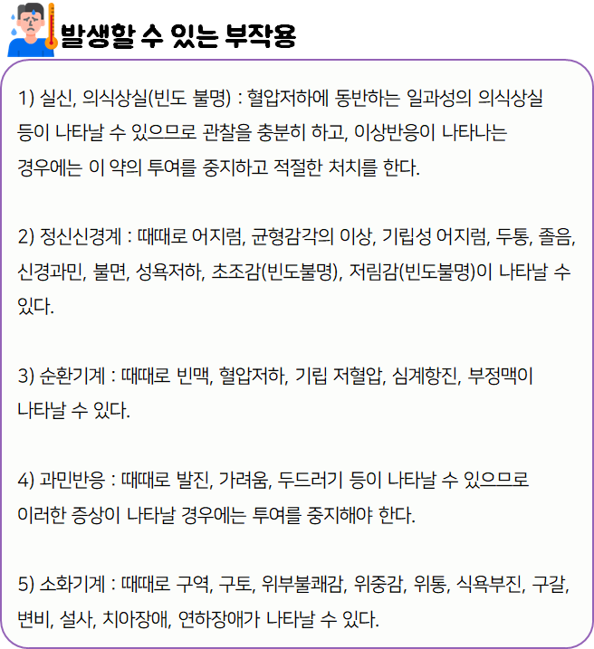 이 약을(를) 복용할 시 다음과 같은 부작용이 발생할 수 있으니 주의하시기 바랍니다.