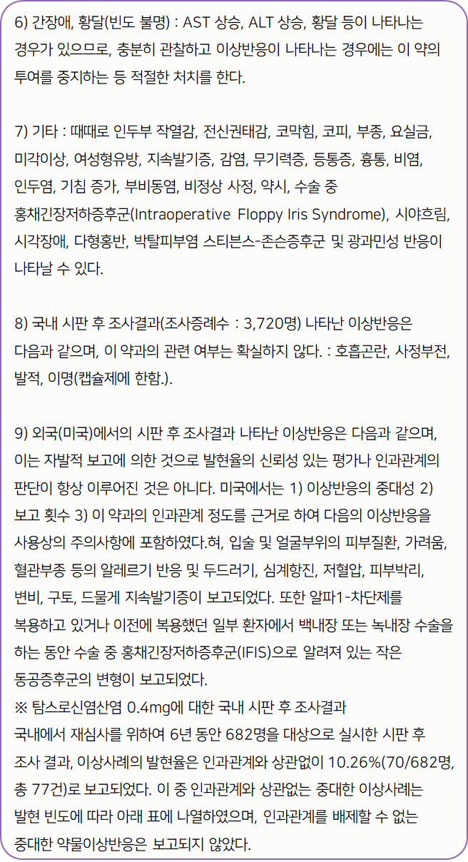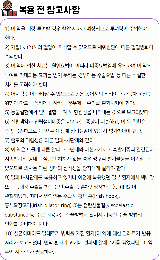 이 의약품은 전립선 평활근을 이완시켜 요도 압력을 낮춤으로써 전립선비대로 인한 증상을 개선시키는 약이니 참고하시길 바랍니다.