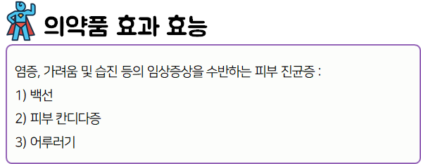 이 의약품은 '항진균 작용을 나타냄으로써 곰팡이균(진균)에 의한 피부 감염증을 치료하는 약'이니 참고하시길 바랍니다.