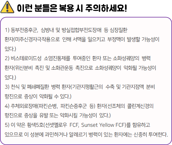의약품은 반드시 복용 전에 복용 시 발생할 수 있는 부작용이나 주의사항 등을 미리 확인하신 후 드셔야 안전하게 먹을 수 있습니다.