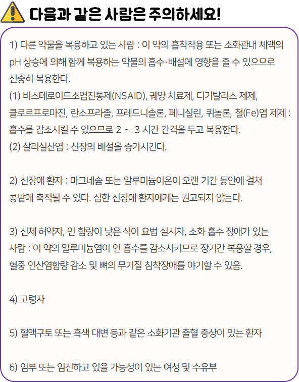 이 의약품은 '위산을 중화하고, 펩신(단백분해효소)의 작용을 감소시킴으로써 위내 통증 및 궤양형성을 방지하는 약'이니 참고하시길 바랍니다.