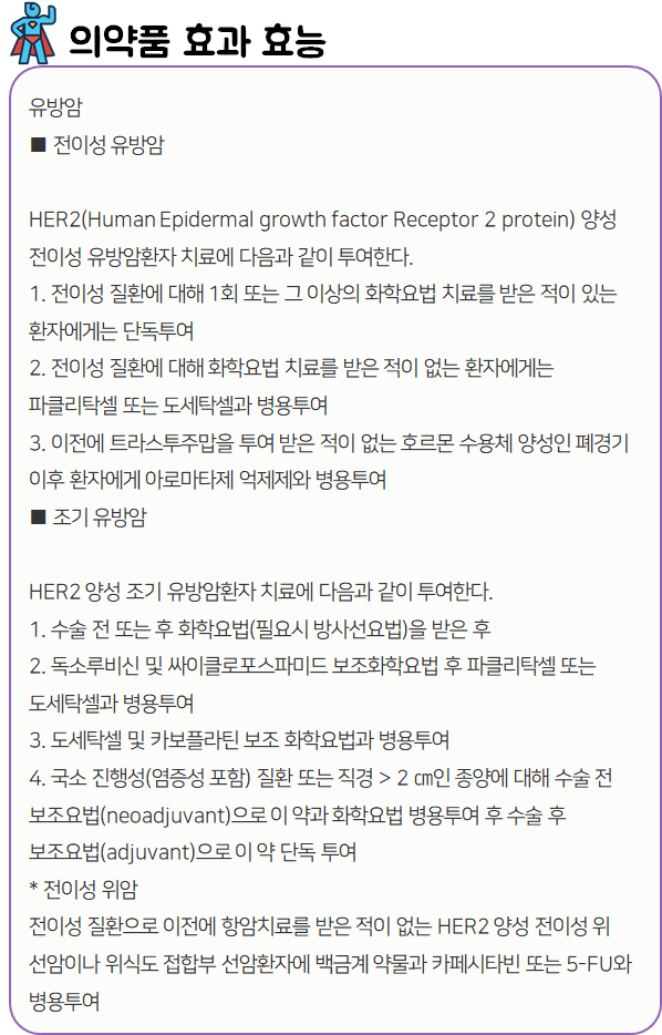 이 의약품은 ' HER2 수용체에 결합하여 종양세포가 복제하여 증식되는 것을 막아 종양세포 사멸을 유도하는 약'이니 참고하시길 바랍니다.