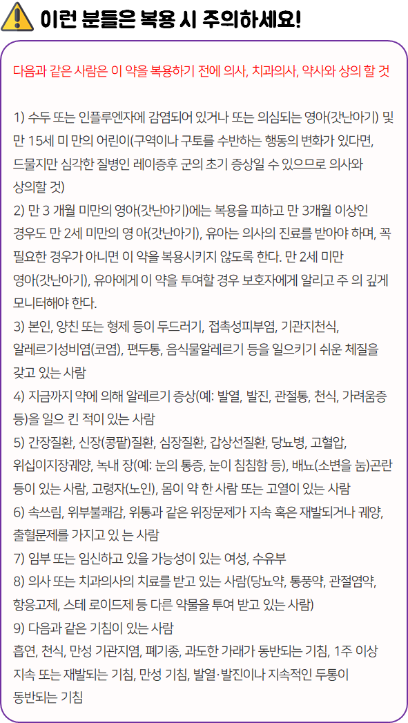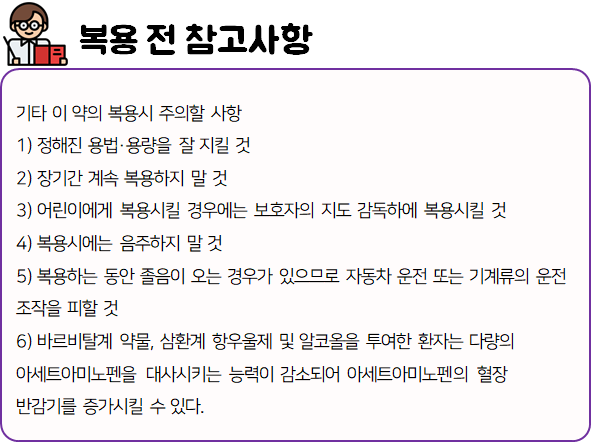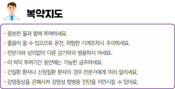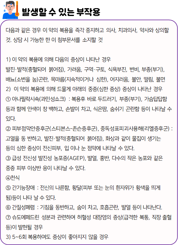 의약품은 반드시 복용 전에 복용 시 발생할 수 있는 부작용이나 주의사항 등을 미리 확인하신 후 드셔야 안전하게 먹을 수 있습니다.