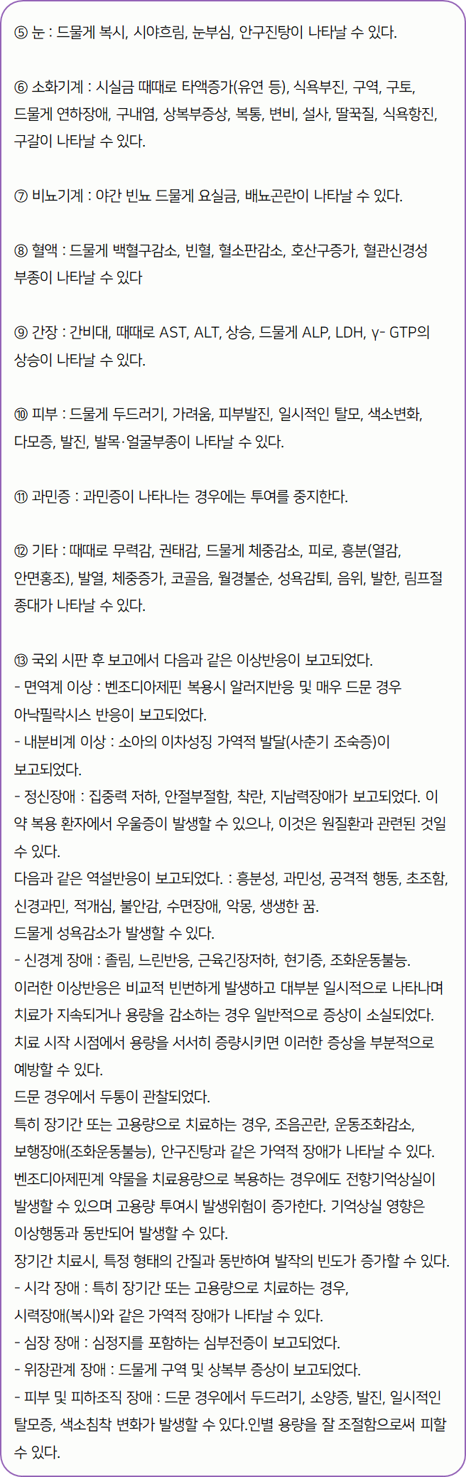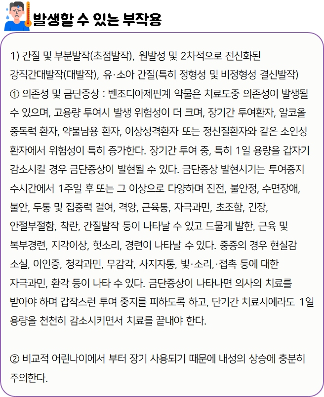 환인 클로나제팜정0.5mg을(를) 복용할 시 다음과 같은 부작용이 발생할 수 있으니 주의하시길 바랍니다.
