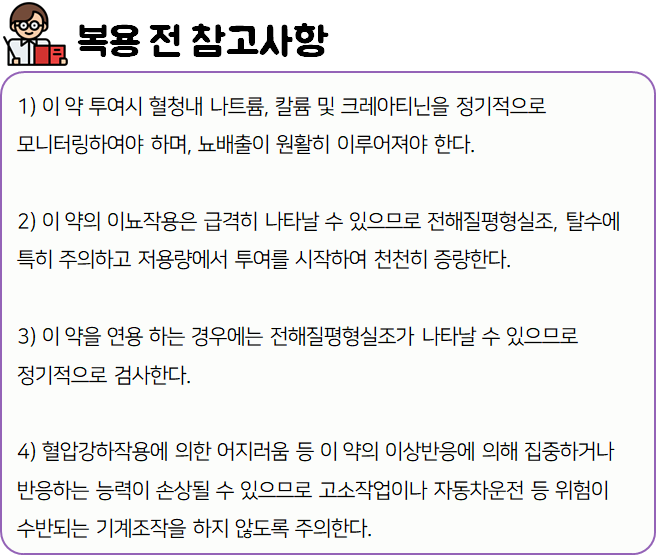 이 의약품은 신장에서 나트륨 및 수분의 재흡수를 억제하여 혈압을 감소시키고 부종을 치료하는 약이니 참고하시기 바랍니다.