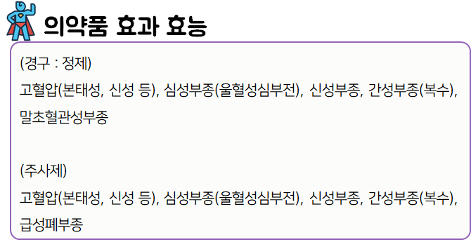 이 의약품은 신장에서 나트륨 및 수분의 재흡수를 억제하여 혈압을 감소시키고 부종을 치료하는 약이니 참고하시기 바랍니다.