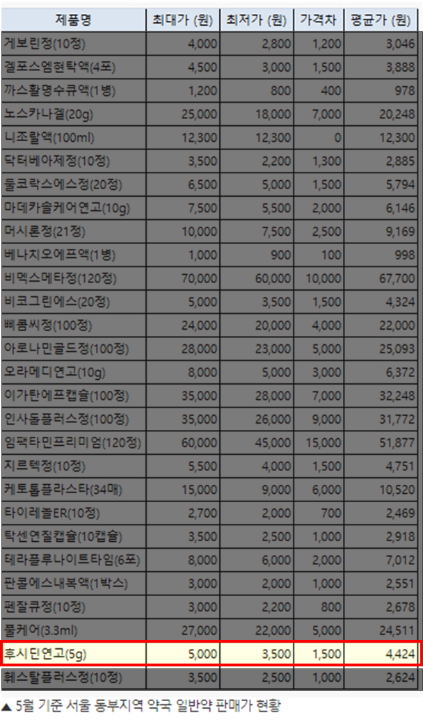 현재 유통되고 있는 후시딘 연고의 가격을 보면 최대가 5,000원 최저가 3,500원으로 1,500원 정도의 차이를 보이고 있습니다.