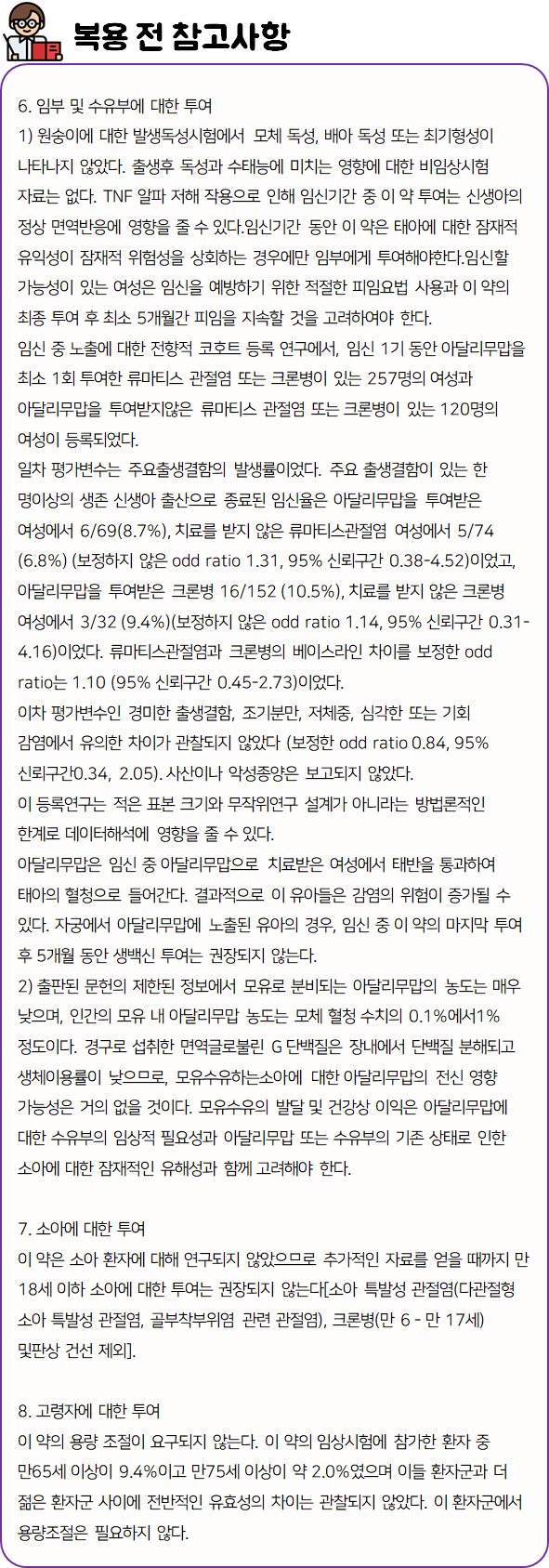 지금까지 휴미라에 대한 정보를 알려드렸는데요, 의약품은 드시기 전에 반드시 주의사항이나 부작용 등을 미리 체크하시길 바랍니다.