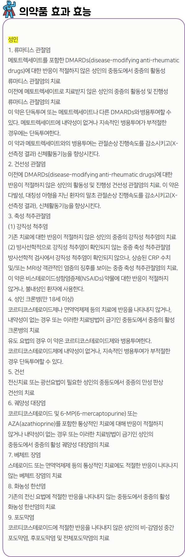 이 의약품은 과도한 염증 및 세포손상을 억제함으로써 관절염을 치료하는 약이니 참고하시길 바랍니다.