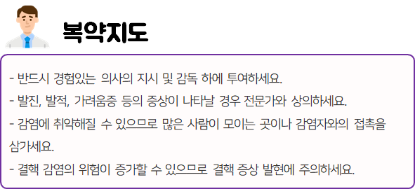 또한 투여 중 부작용 등의 이상반응이 나타날 시 즉시 복용을 멈추고, 전문가 or 의사와 상담하신 후에 복용 지속 여부를 결정하시는 것이 좋습니다.