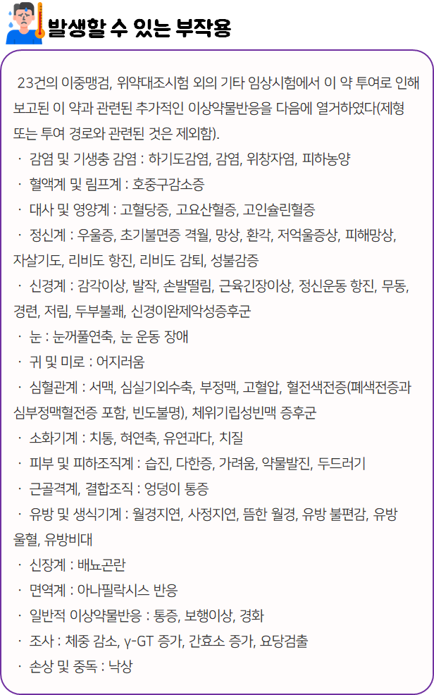 또한 혹시나 복용 중 부작용 등의 이상반응이 나타날 시 즉시 복용을 멈추고, 전문가 or 의사와 상담하신 후에 복용 지속 여부를 결정하시는 것이 좋습니다.