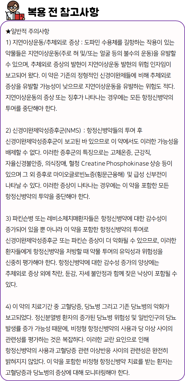 지금까지 리페리돈정에 대해 알려드렸는데요, 의약품은 드시기 전에 반드시 주의사항이나 부작용 등을 미리 체크하시기 바랍니다.